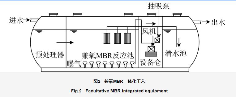為減少膜污染、提升膜壽命,王陽等[41]發明了一種旋轉膜生物氣升式循環反應器,其中膜過濾裝置包括旋轉接頭和曝氣管,膜組件可通過旋轉接頭驅動旋轉,該發明降低了設備能耗,減少了維護成本。為驗證工藝在北方寒冷地區的適用性,晁雷等[42]在遼寧省某村生活污水處理中采用兼氧MBR分散式污水處理與回用一體化工藝(圖2),工程試運行發現,采用地下埋置保溫方式,在溫度低的北方冬季該工藝能正常運行,兼性厭氧菌可適應含氧量變化,適用于進水量波動大的農村地區的生活污水處理,出水能穩定達到GB 18918—2002一級B標準。